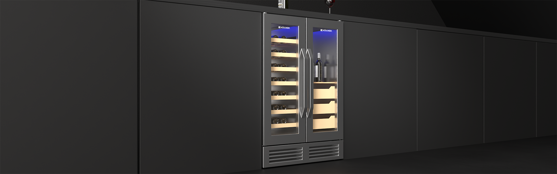 Tủ bảo quản rượu và cigar KÖCHER mang thiết kế sang trọng kiểu Side by Side, dung tích 120L với hai ngăn nhiệt độ độc lập. Hệ thống làm lạnh khí nén êm ái kết hợp kệ gỗ sồi và gỗ tuyết tùng cao cấp, đảm bảo lưu trữ rượu và cigar trong điều kiện lý tưởng.