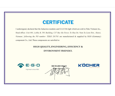 Chúng tôi hợp tác cùng các tập đoàn công nghệ hàng đầu thế giới như EuroKera (Nhà sản xuất mặt kính hàng đầu tại Pháp), E.G.O (Nhà sản xuất bo mạch hàng đầu tại Đức), Schott Ceran (Nhà sản xuất mặt kính hàng đầu tại Đức), nhằm mang đến những thiết bị bếp đạt tiêu chuẩn quốc tế về an toàn, hiệu suất và thẩm mỹ. Mỗi sản phẩm Köcher là kết tinh của chất lượng, độ chính xác và sự tinh giản — Dành cho những ai trân trọng trải nghiệm sống đẳng cấp trong từng chi tiết.