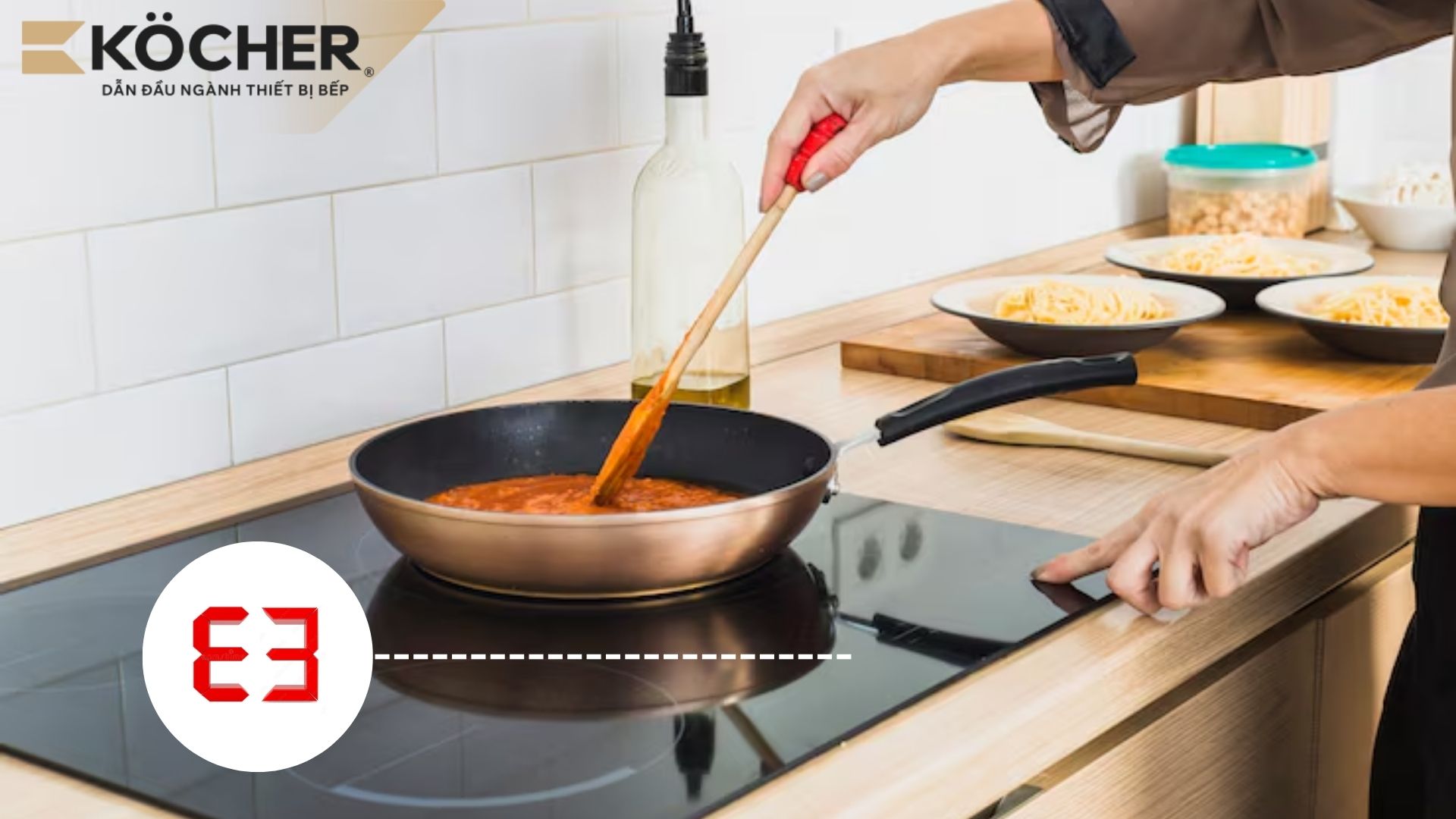 - Với bếp từ Sunhouse hoặc một số dòng bếp hồng ngoại, E3 xuất hiện khi vùng nấu quá nhiệt hoặc lỗi cảm biến nhiệt bị hư hỏng.