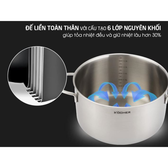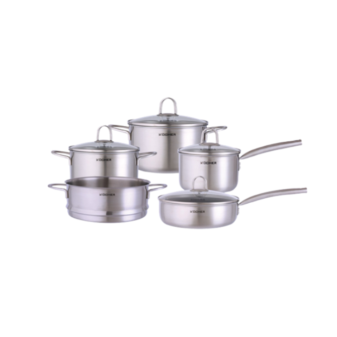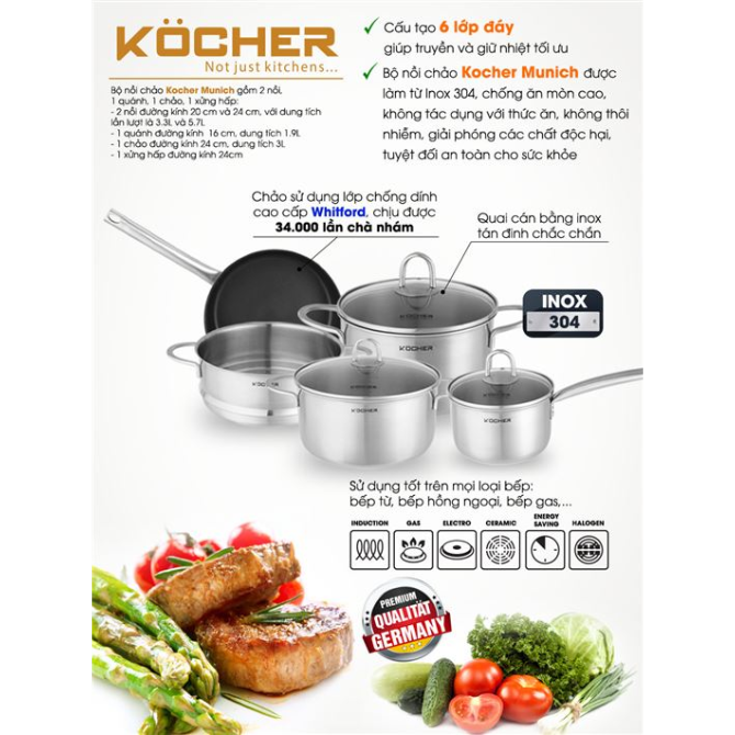 Bộ nồi 5 món KÖCHER MUNICH bao gồm 1 nồi luộc gà size lớn 24cm, 1 nồi size 20cm, 1 quánh size 16cm, 1 chảo chống dính & 1 xửng hấp tiện lợi size 24cm.
