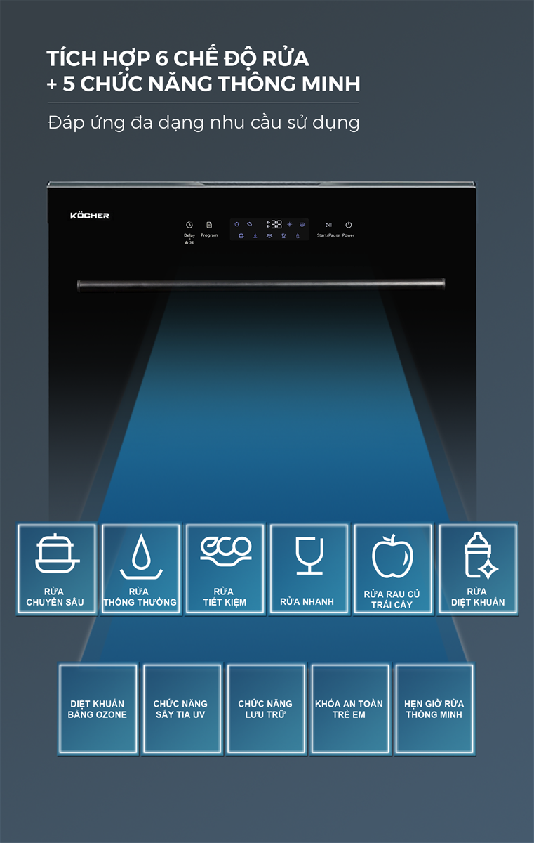 Máy rửa bát Kocher KDEU-8839 được tích hợp 6 chương trình rửa bao gồm rửa chuyên sâu, rửa thường, rửa tiết kiệm, rửa nhanh, rửa rau củ trái cây, rửa diệt khuẩn cùng với 5 chức năng thông minh như: Diệt khuẩn bằng Ozone, chức năng sấy bằng tia UV, chức năng lưu trữ, khóa an toàn trẻ em, hẹn giờ rửa thông minh.