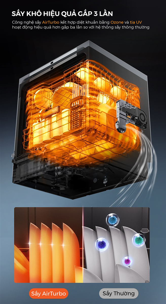 Công nghệ tia UV và khử khuẩn bằng Ozone giúp ngăn ngừa sự phát triển vi khuẩn và tiêu diệt 99.9999% vi khuẩn còn lại sau chu trình rửa. Máy rửa bát được tích hợp công nghệ tia UV và khử khuẩn bằng Ozone bên trong và sẽ tự động khử trùng, diệt vi khuẩn sau mỗi lần rửa nó giúp ích và bảo vệ các gia đình khỏi mầm mống bệnh tật và các bệnh truyền nhiễm hiệu quả hơn gấp 3 lần so với sấy thông thường.