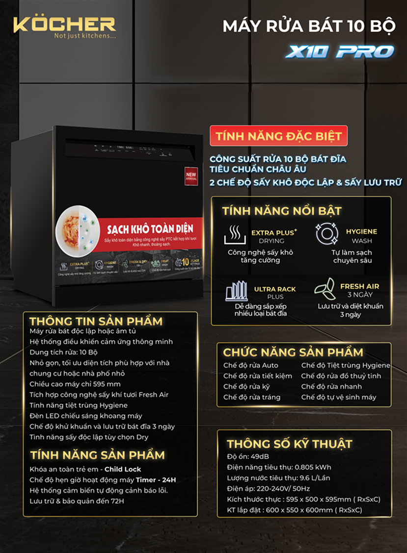 Với chiều cao chỉ 595mm, Köcher X10 PRO có thể lắp đặt độc lập hoặc âm tủ, dễ dàng tương thích với nhiều kiểu bếp tại chung cư hoặc nhà phố nhỏ. Thiết kế tối giản, tinh tế kết hợp với bảng điều khiển cảm ứng thông minh tạo nên một tổng thể hiện đại, gọn gàng và thẩm mỹ.