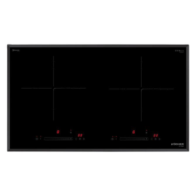 Bếp từ đôi Köcher DI-988 sở hữu thiết kế mặt kính vát cạnh, bo viền Aluminum giúp tăng độ bền và tính thẩm mỹ. Màu đen bóng huyền bí kết hợp với họa tiết sắc nét trên mặt kính mang đến vẻ đẹp sang trọng, dễ dàng kết hợp với nhiều không gian bếp khác nhau.