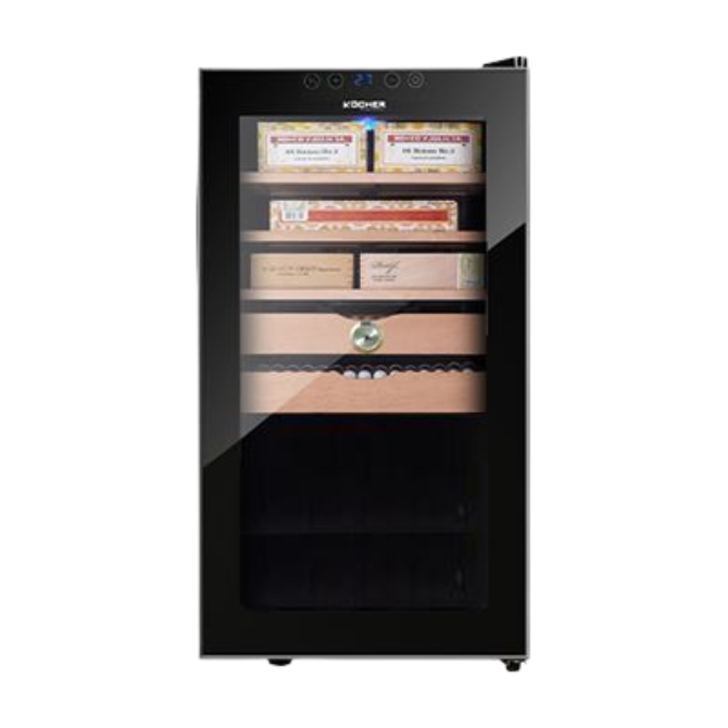Tủ bảo quản cigar KÖCHER mang thiết kế sang trọng, dung tích 70L với điều khiển cảm ứng. Hệ thống làm lạnh khí nén êm ái kết hợp kệ gỗ sồi và gỗ tuyết tùng cao cấp, đảm bảo lưu trữ cigar trong điều kiện lý tưởng.